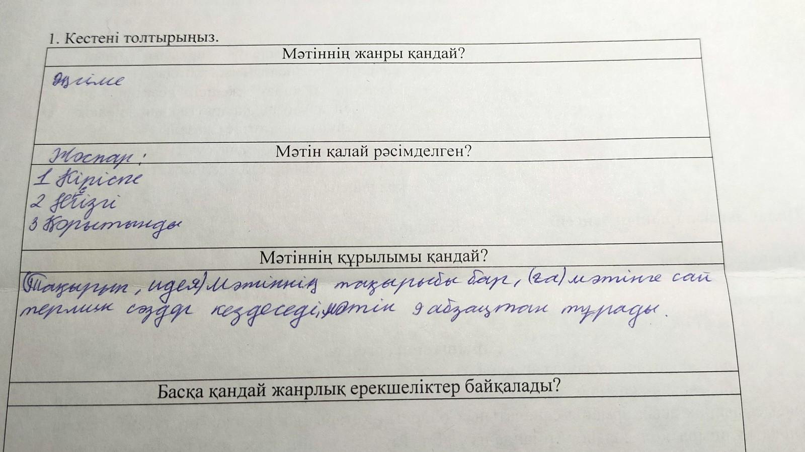 Ғарышты игерген ел Кестені толтырыңыз. Мәтіннің жанры қандай? a igo с ранее на тестості от roo hаіrоtе iorio igora 07 Мәтін калай рәсімделген? го ното папа Мәтіннің құрылымы кандай? imir с — Басқа қандай жанрлық ерекшеліктер байкалады? на нет