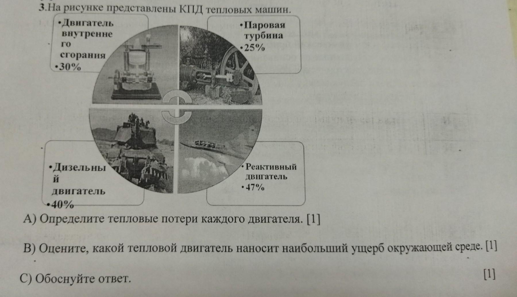 3.На рисунке представлены КПД тепловых машин. •Двигатель •Паровая внутренне турбина • 25% сгорания • 30% го я F Nu ДВПгатель •Дизельны Реактивный й • 47% Двигатель • 40% А) Определите тепловые потери каждого двигателя. [1] В) Оцените, какой тепловой двигатель наносит наибольший ущерб окружающей среде. C) Обоснуйте ответ,
