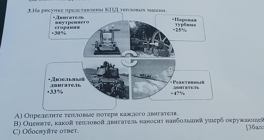 на рисунке представлены кпд тепловых машин. определите тепловые потери каждого двигателя. оцените какой тепловой двигатель наносит наибольший ущерб окружающей среде. обоснуйте ответ