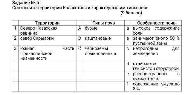 Задание № 5 Соотнесите территории Казахстана и характерные им типы почв (9 баллов) Территории Типы почв Особенности почв 1 Северо-Казахская равнина А бурые а высокое содержание соли 2 север Сарыарки В каштановые в занимают около 50 % пустынной зоны 3 южная часть Прикаспийской низменности С черноземы обыкновенные с непригодны для земледелия d отличаются глыбистой структурой е распространены в сухих степях