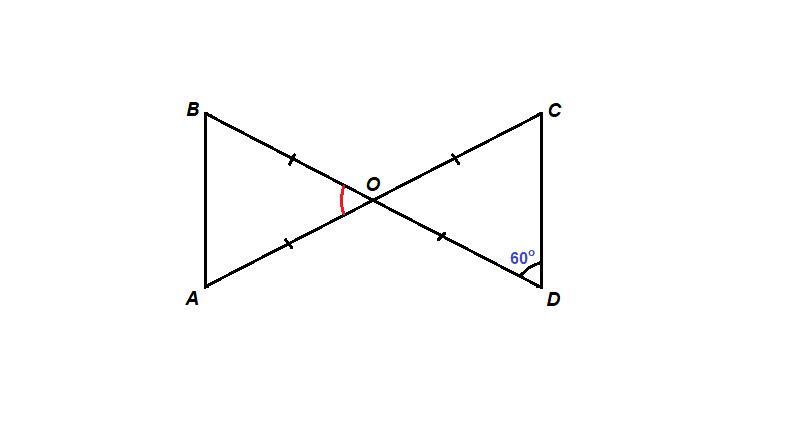 Равные отрезки АС И ВД пересекаются в точке О. Точка О делит эти отрезки пополам. Проведены отрезки АС и ДС Чему равен угол БОА если СДО =60°