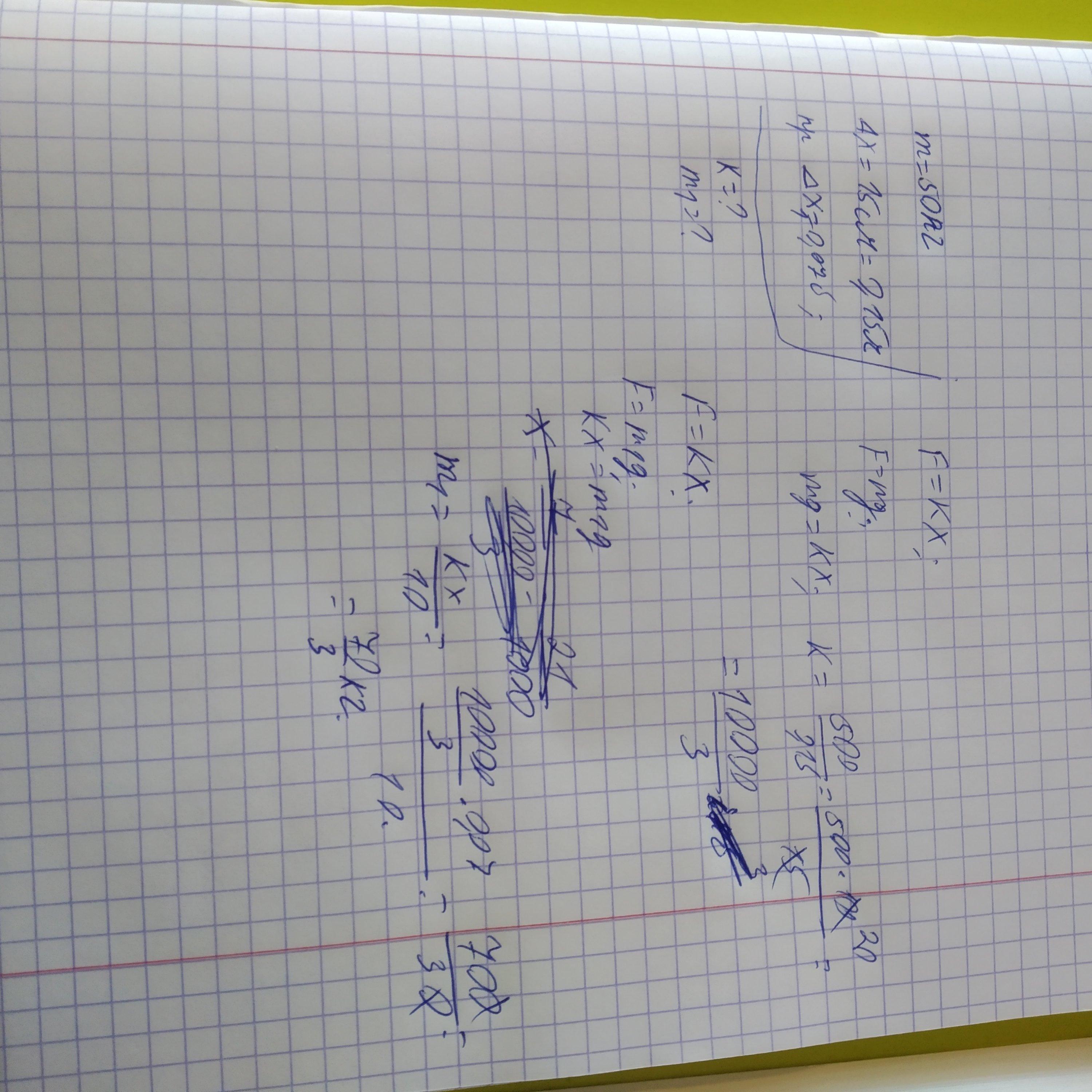 Груз массой 50 кг подвешен на шнуре, при этом шнур удлинился только на 15 см. Определить коэффициент жёсткости шнура. Зная коэффициент жёсткости найти какой должна быть масса груза, что бы шнур удлинился на 7 см