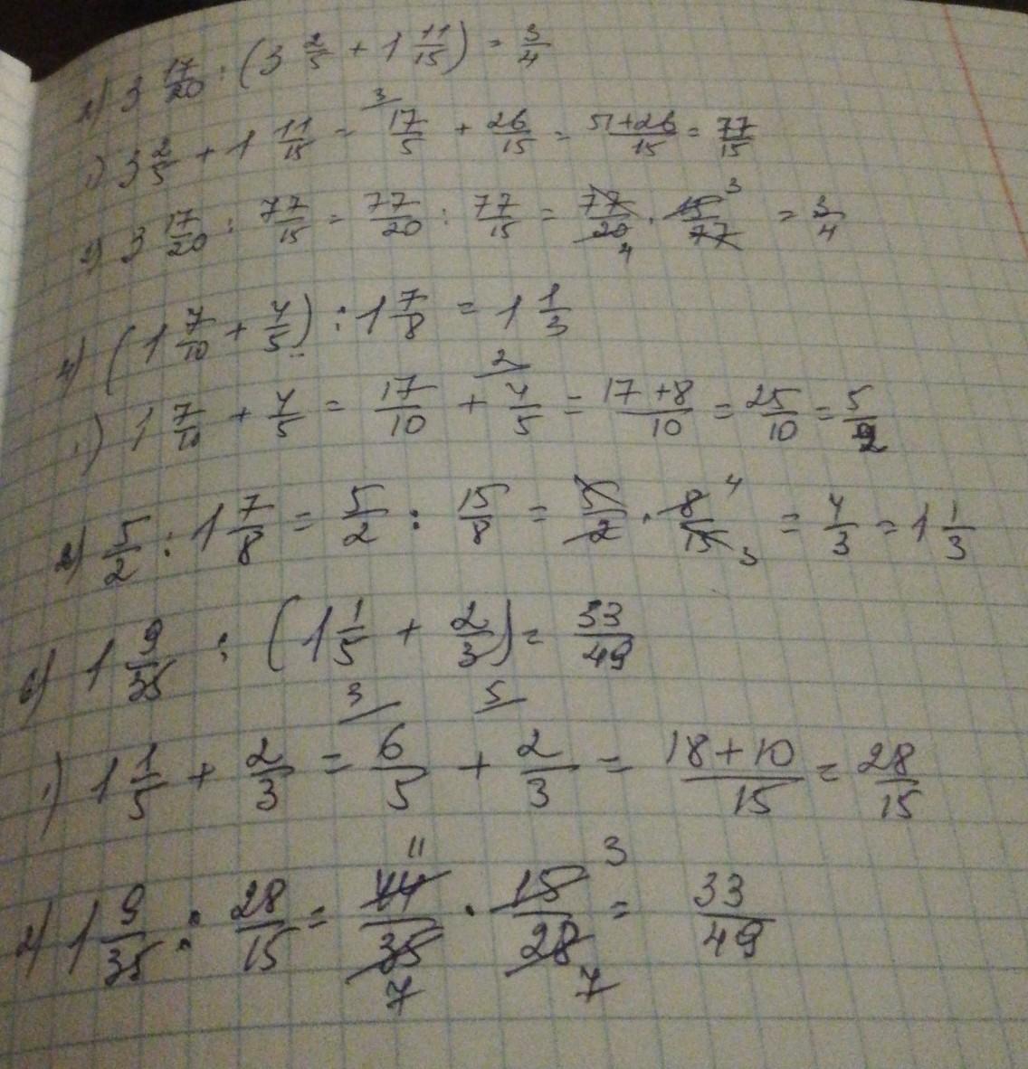 2. 3 17/20 : (3 2/5 + 1 11/15) = 77/20 : (3 6/15 + 1 11/15) = 77/20 : 5 2/15 =