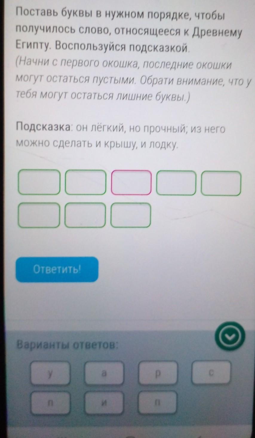 Подсказка он легкий, но прочный, из него можно сделать и крышу, и лодку Ответить! > Предыдущее Задание Список задании Следующее задание Отправить отзыв Варианты ответов: у а р О. П И П