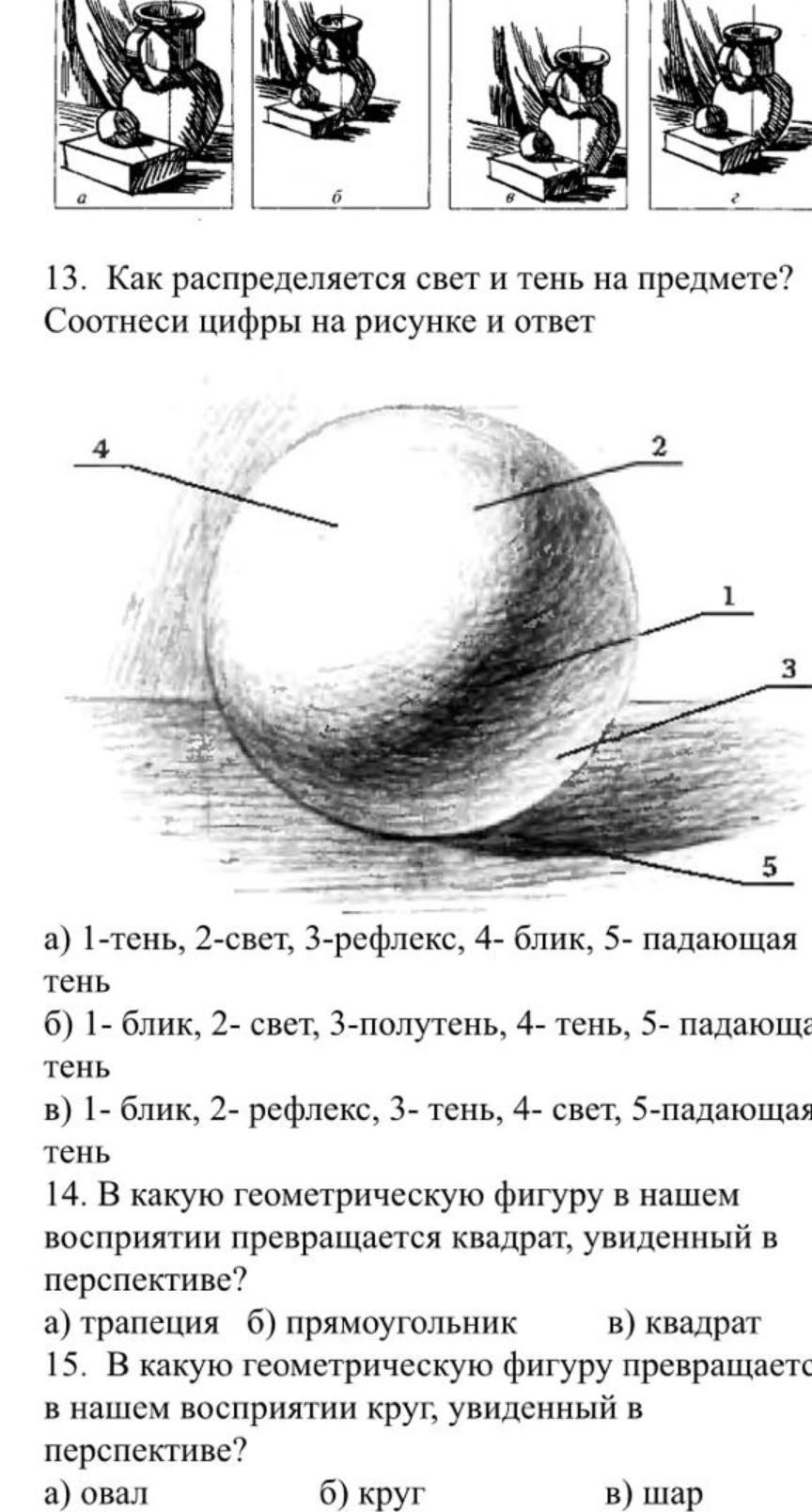 а) 1-тень, 2-свет, 3-рефлекс, 4-блик, 5-падающая тень.