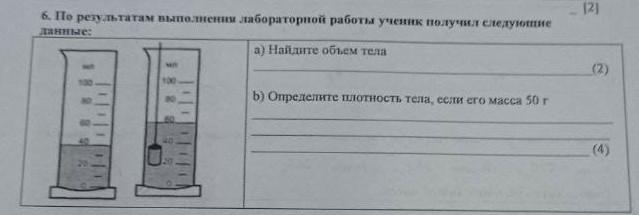 объем 10 из 50-40=10 вытесненая вода т. е масса бруска