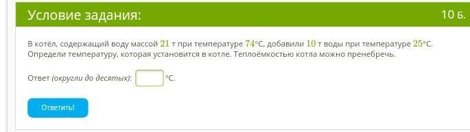 В котёл, содержащий воду массой 21 т при температуре 74°C, добавили 10 т воды при температуре 25°C. Определи температуру, которая установится в котле. Теплоёмкостью котла можно пренебречь. Ответ (округли до десятых): °C.