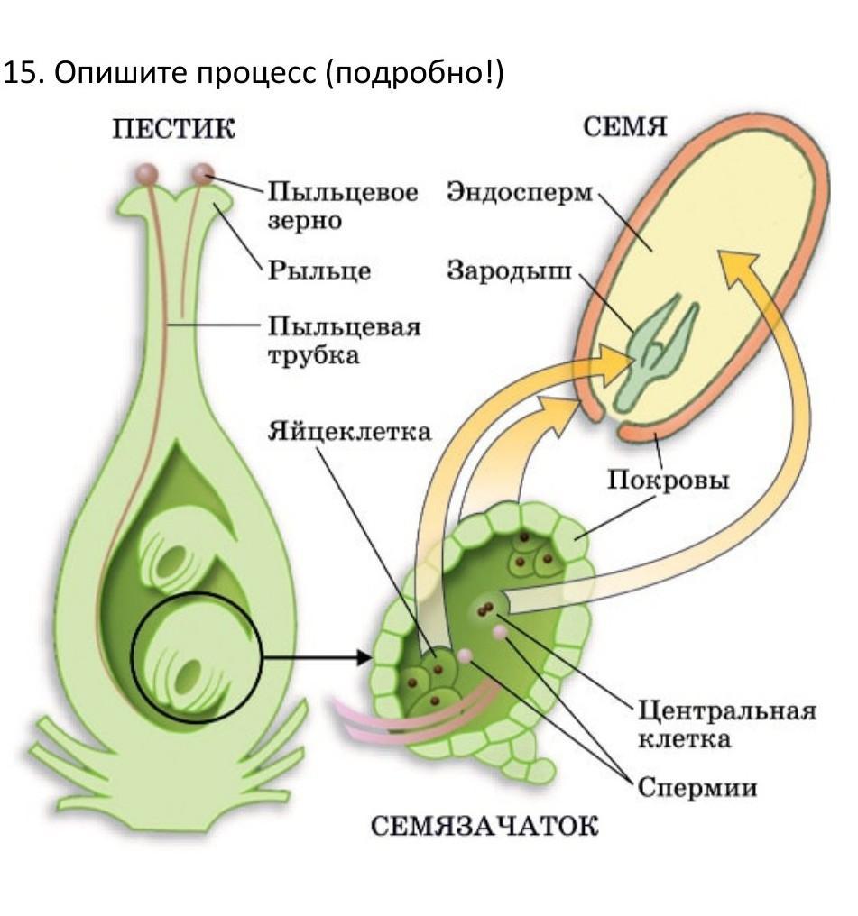 Когда пыльцевое зерно попадает на рыльце пестика, вегетативная клетка зерна начинает делится и образует пыльцевую трубку, которая прорастает через ткани пестика и проникает в семязачаток. Для этого в семезачатке есть специальное отверстие — пыльцевход.