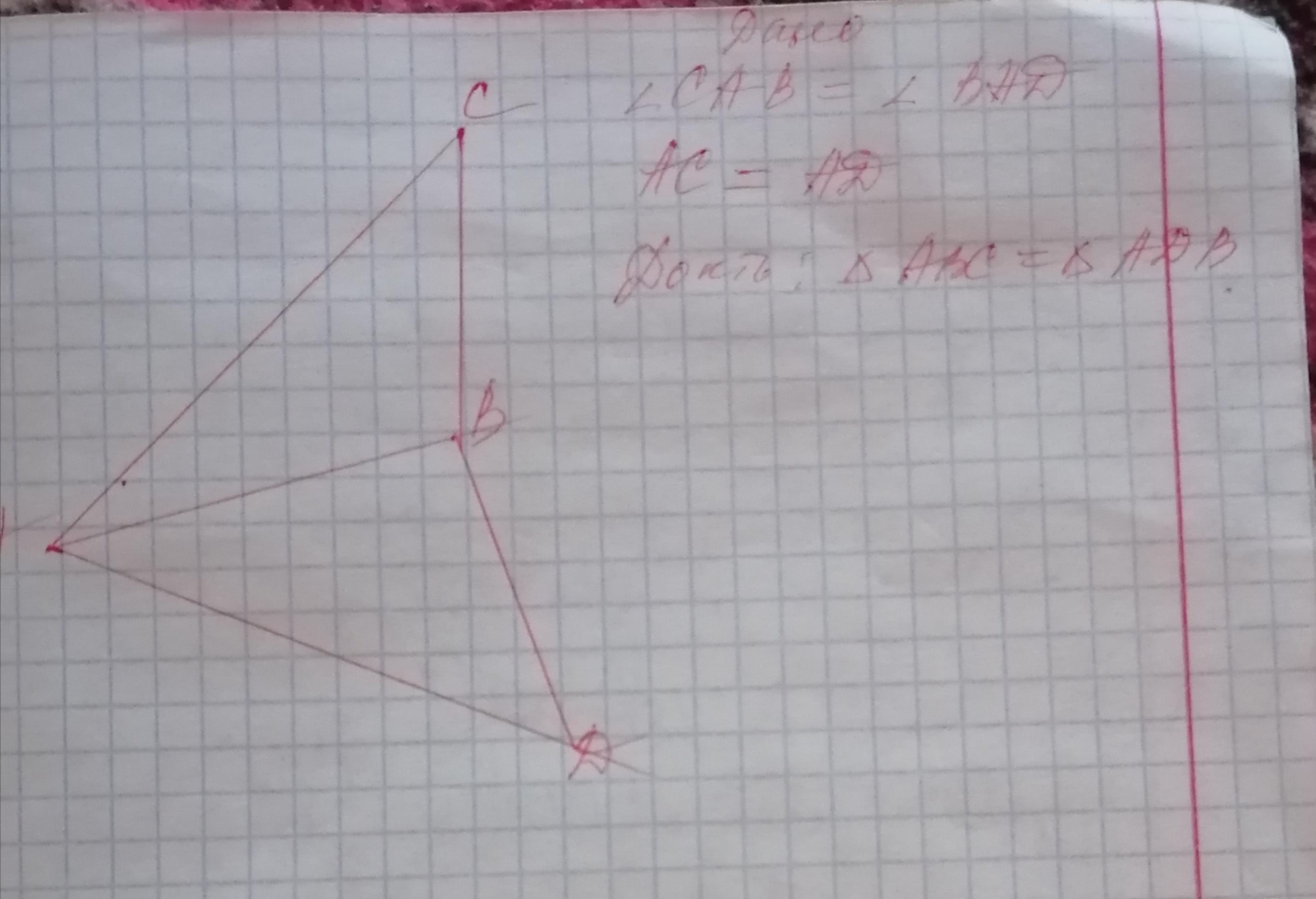 треугольник авс равен треугольнику adb за двумя сторонами и углом между ними. ba общая сторона для треугольников, так как угол cab = bad, и находиться между сторонами ac и ba; ba и ad. так что за двумя сторонами и углом