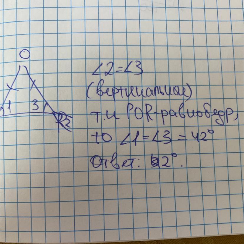 ∠ORP=∠2 как вертикальные. Углы при основании равнобедренного треугольника равны, ∠1=∠ORP=∠2=42