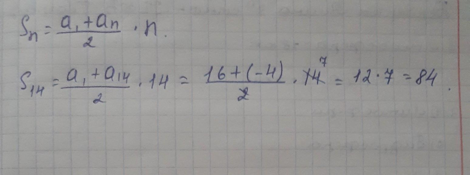 Найти сумму первых четырнадцати членов арифметической прогрессии, если а1 = 16, а14 = -4.
