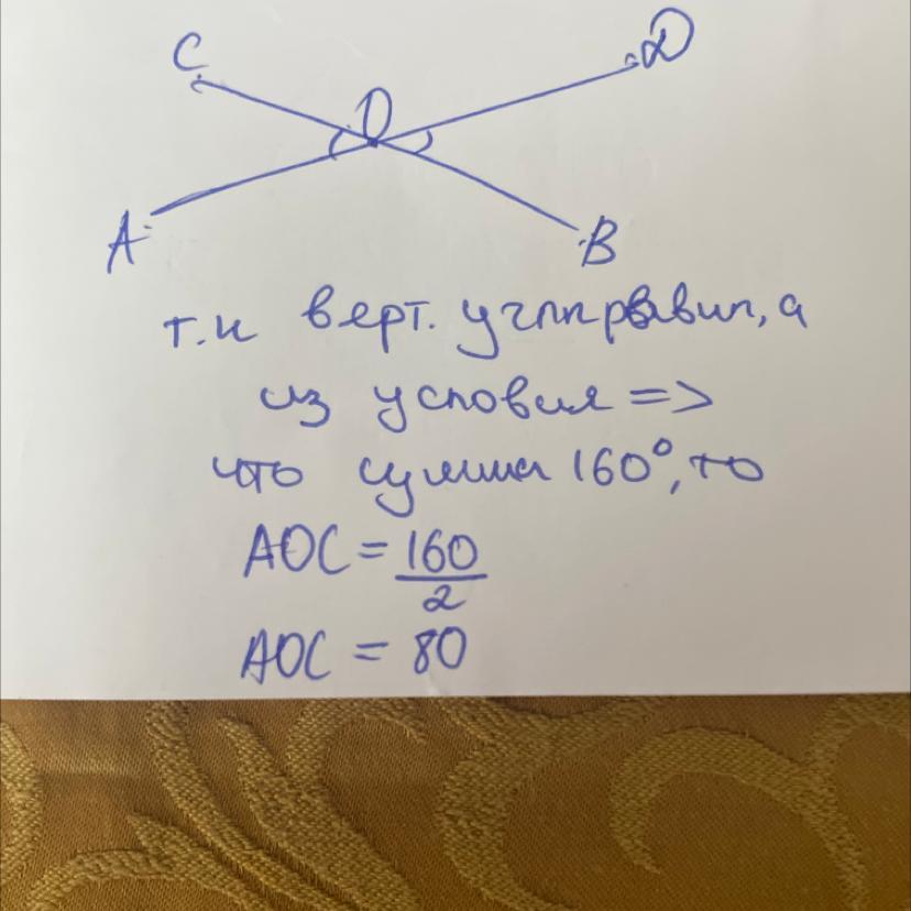 Сумма вертикальных углов АОС и BOD, образованных при пересечении прямых AD и ВС, равна 160 градусов. Найдите угол АОВ
