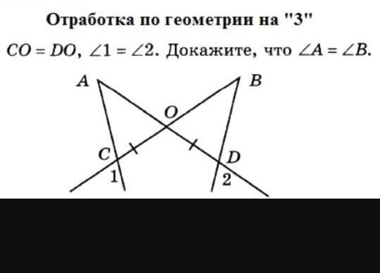треугольник АОС=ВОД по 2 признаку: угол 1 = углу АСО ( т к они вертикальные ), угол 2 = углу ОДВ ( т к они вертикальные) э, угол АОС = углу ВОД ( вертикальные) => мы получаем: угол С равен углу Д, СО= ОД, угол АОС = углу ВОД. ч. т. д. Угол А равен углу В как соответствующие элементы в равных треугольниках