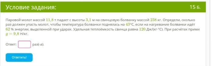 Паровой молот массой 11,8 т падает с высоты 3,1 м на свинцовую болванку массой 238 кг. Определи, сколько раз должен упасть молот, чтобы температура болванки поднялась на 43°С, если на нагревание болванки идёт 62 % энергии, выделенной при ударах. Удельная теплоёмкость свинца равна 120 Дж/(кг·°С). При расчётах прими g=9,8 Н/кг. Ответ: раз(-а).