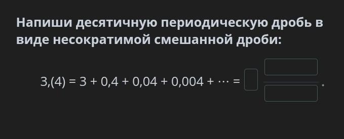 Напиши десятичную периодическую дробь в виде несократимой смешанной дроби: 3,(4) = 3 + 0,4 + 0,04 + 0,004 + …