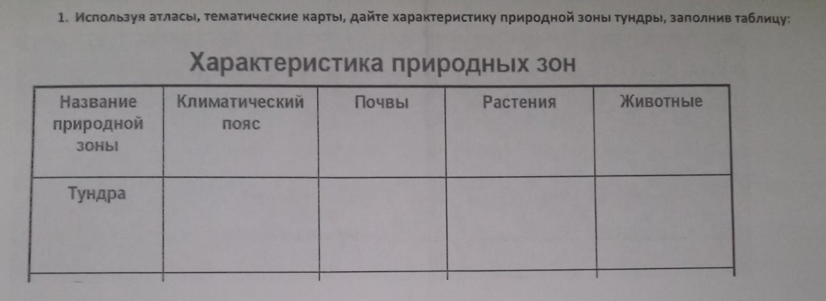 Используя атласы, тематические карты, дайте характеристику природной зоны тундры, заполнив таблицу: