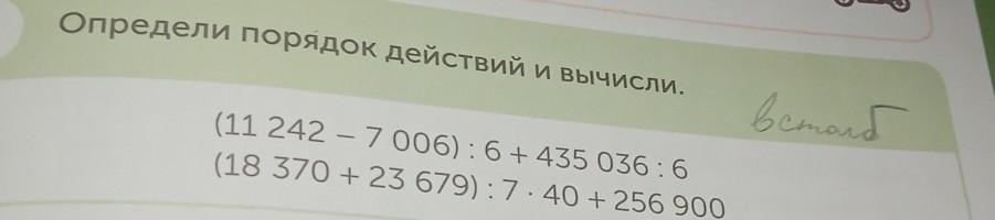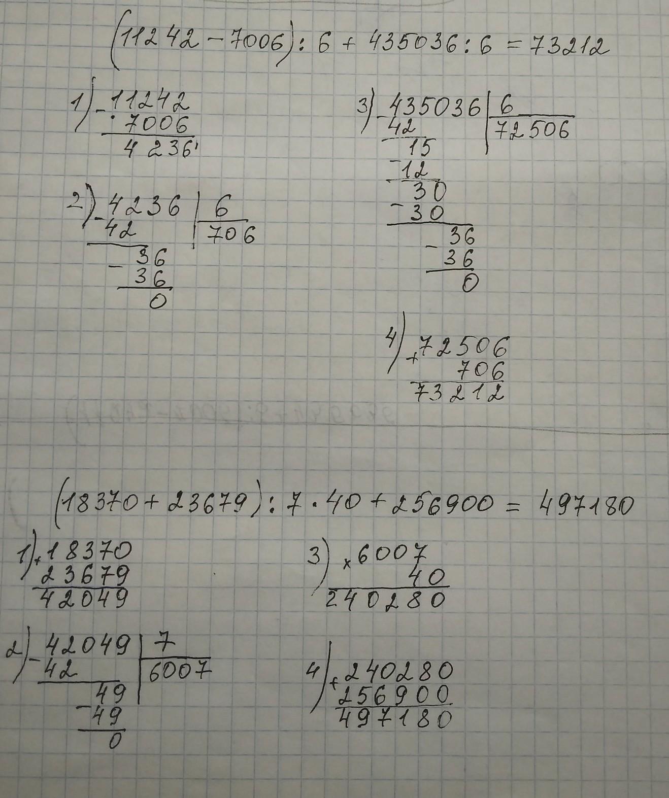 6 Вычисли. 1)(11 242 - 7 006): 6 + 435 036:6. 2) (18 370 + 23 679): 7.40 + 256 900 в столбик