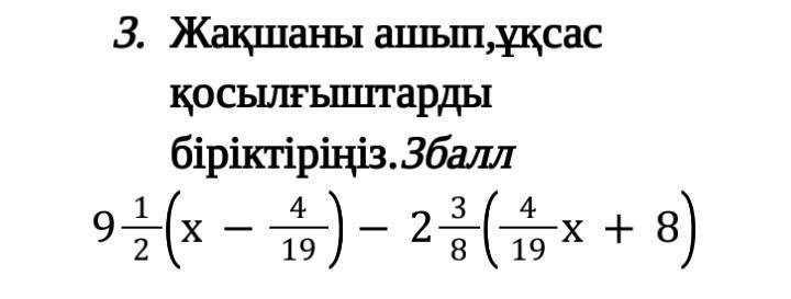 9 \frac{1}{2} (x -  \frac{4}{19} ) - 2 \frac{3}{8} ( \frac{4}{19} x + 8) \\  \frac{9}{2}  \times (x -  \frac{4}{19} ) -  \frac{3}{4}  \times ( \frac{4}{19} x + 8) \\  \frac{9}{2} x -  \frac{18}{19}  -  \frac{3}{19} x - 6 \\  \frac{165}{38} x -  \frac{132}{19}