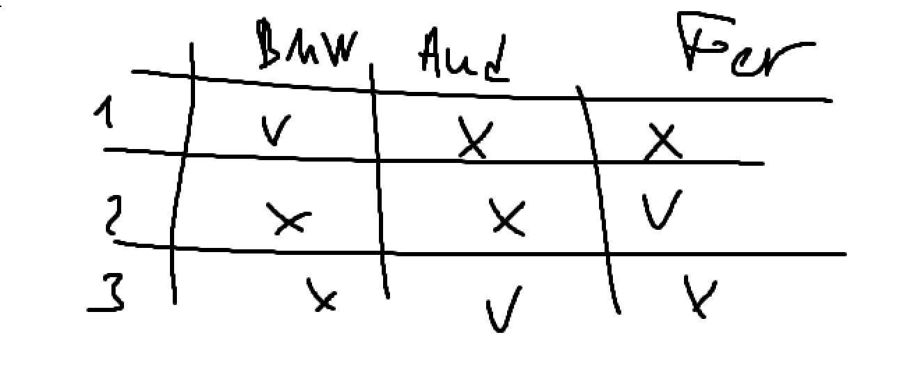 У Саши игрушечный трехэтажный гараж с тремя машинками - BMW, Audi и Ferarri. Известно, что: Машинки, которые находятся на первом І третьем этажах, не Ferarri. Audi находится не на первом этаже. На каком этаже какая машинка? Реш задачу с помощью таблицы