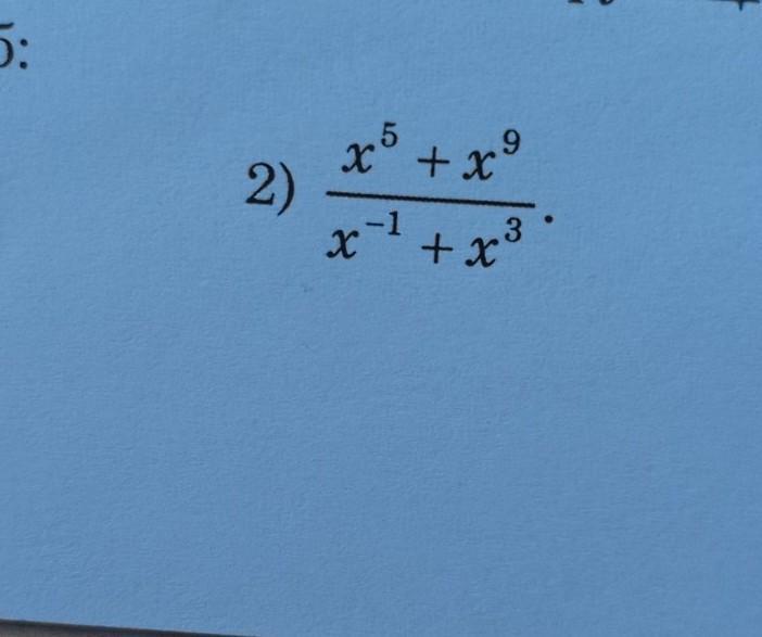 2 ) ( x⁵ + x⁹ )/( x⁻¹ + x³ ) = x⁵( 1 + x⁴)/( 1/x + x³ ) = x⁵( 1 + x⁴)/[( 1 + x⁴)/x ] =