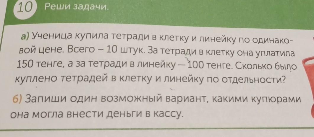 (10) Реши задачи. а) Ученица купила тетради в клетку и линейку по Одинако- вой цене. Всего – 10 штук. За тетради в клетку она уплатила 150 тенге, а за тетради в линейку — 100 тенге. Сколько было куплено тетрадей в клетку и линейку по отдельности? 6) Запиши один возможный вариант, какими купюрами она могла внести деньги в кассу.