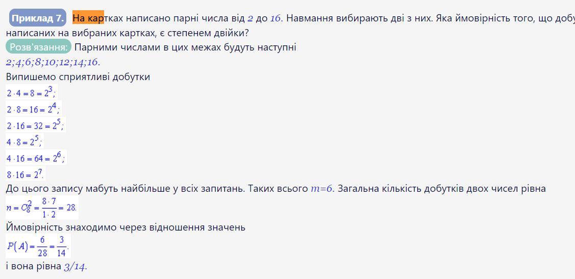 На картках написано парні числа від 2 до 16. Навмання вибирають дві з них. Яка ймовірність того, шщо добуток чисел, написаних на вибраних картках. є степенем двійки?