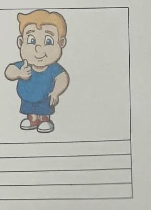 This boy has blue eyes and blue shorts, yellow hair. This boy is fat