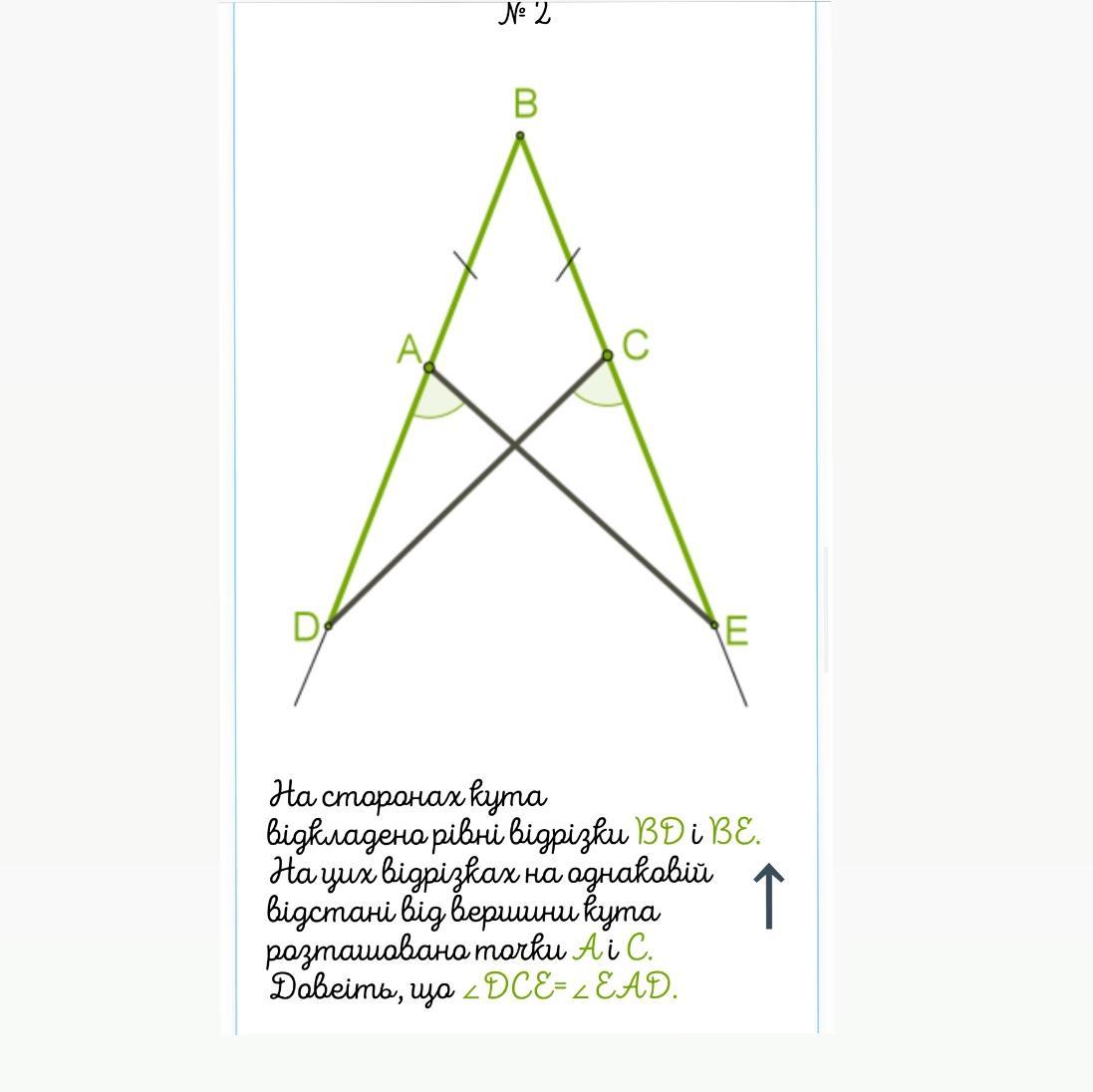 так как стороны ВD и BE равны следовательно углы С и А тоже равны и отрезки DC и АЕ пересекаются в точке допустим О они тоже равны, тем самым равны и углы DCE и ЕАD