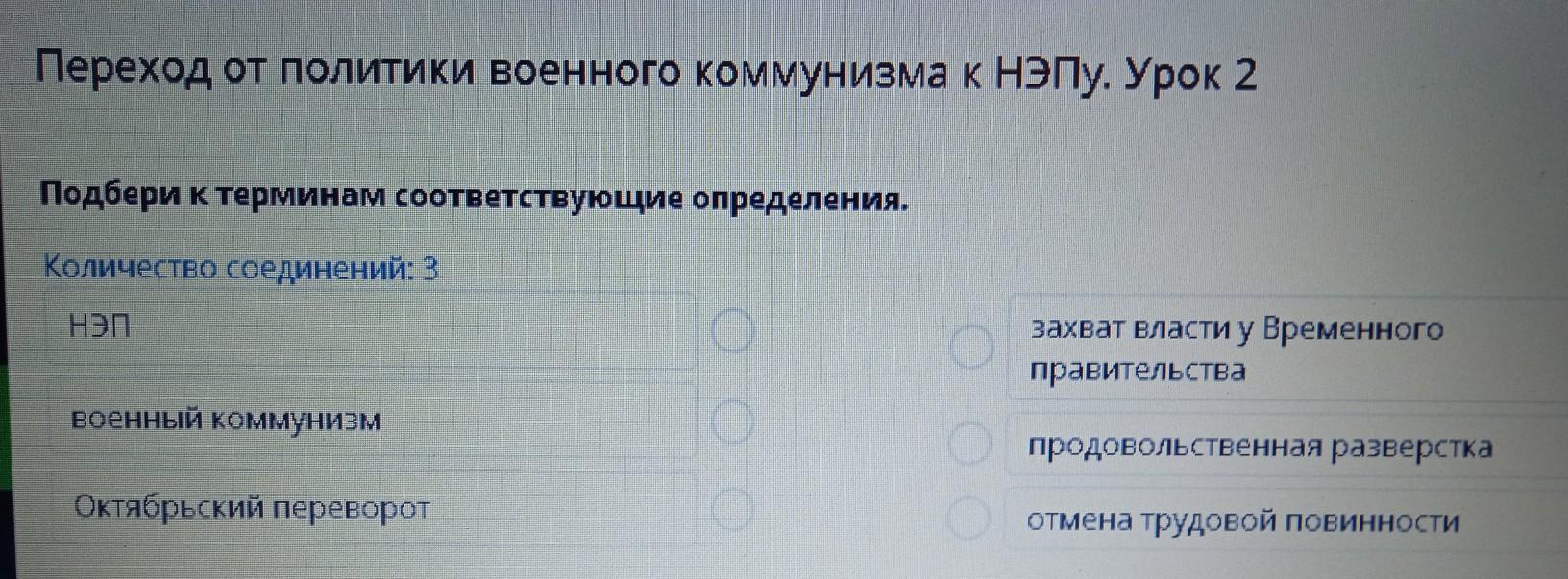Переход от политики военного коммунизма к НЭпу. Урок 2 Подбери к терминам соответствующие определения. Количество соединений: 3 НЭП захват власти у Временного правительства военный коммунизм продовольственная разверстка Октябрьский переворот отмена трудовой повинности