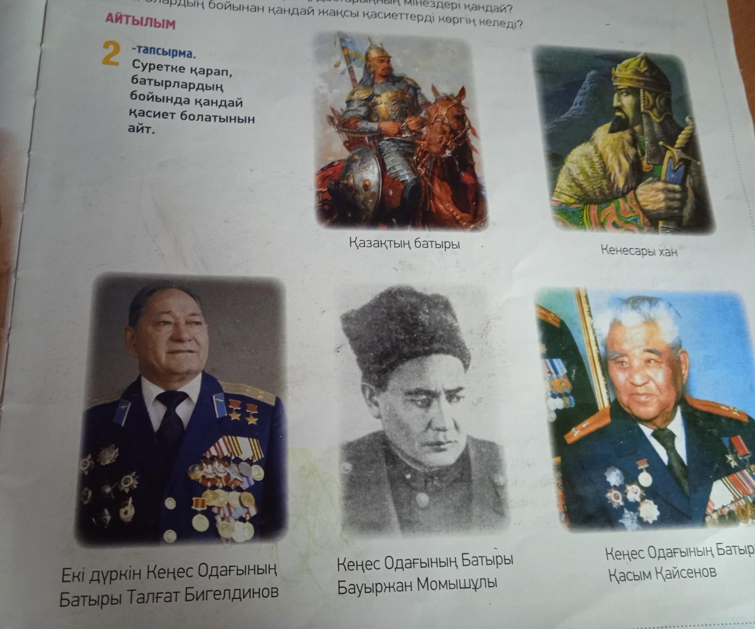 дам 100 БАЛОВ Помогите срочно....АЙТЫЛЫМ 2 тапсырма. Суретке қарап, батырлардың бойында қандай қасиет болатынын айт. Қазақтың батыры Кенесары хан Кеңес Одағын Қасым Қайсе Кеңес Одағының Батыры Бауыржан Момышұлы Екі дүркін Кеңес Одағының Батыры Талғат Бигелдинов