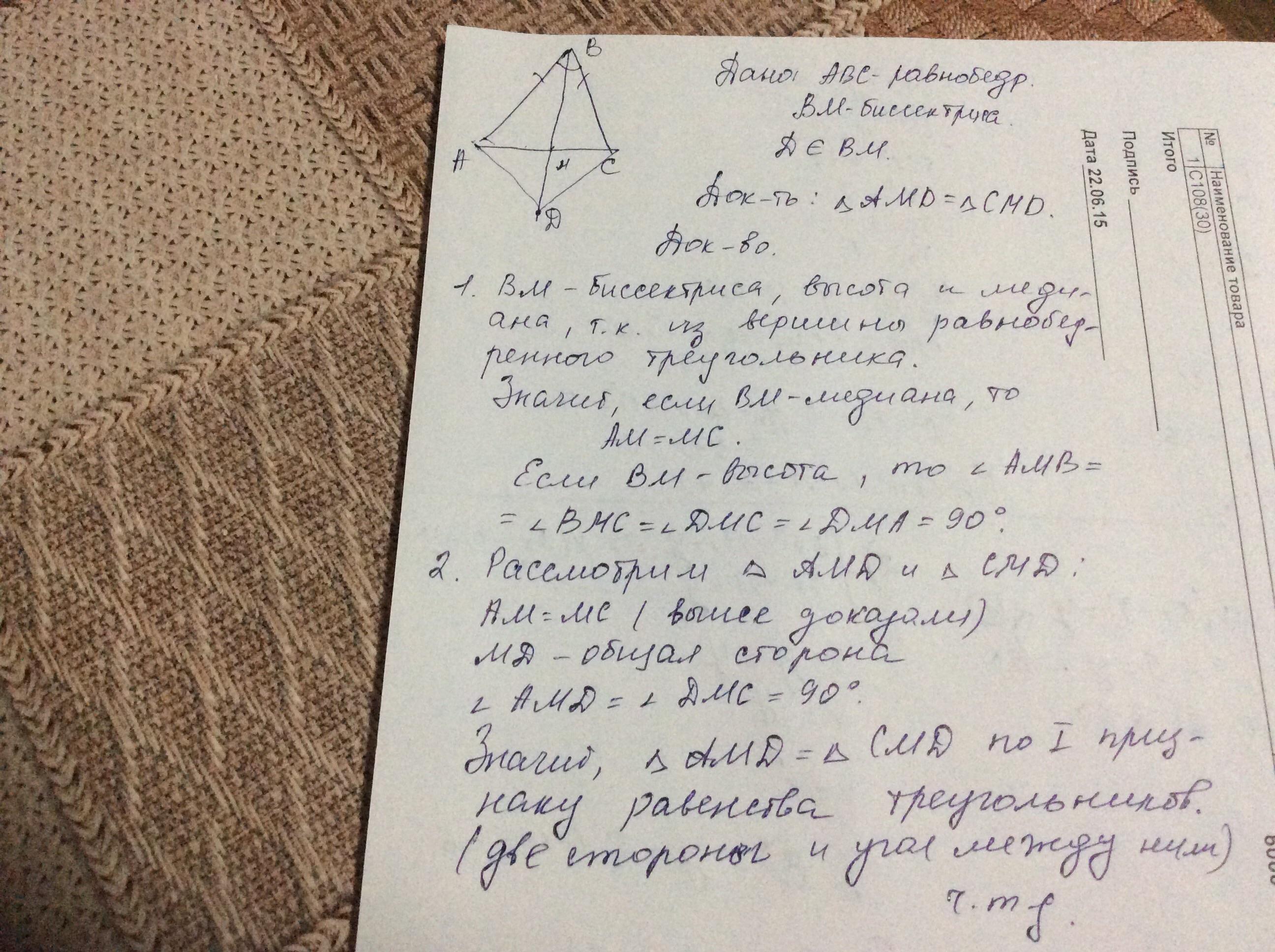 2. В равнобедренном треугольнике ABC с основанием АС проведена биссектриса вм. На продолжении биссектрисы за точку M взята точка D. Докажите, что треугольники AMD и CMD равны.