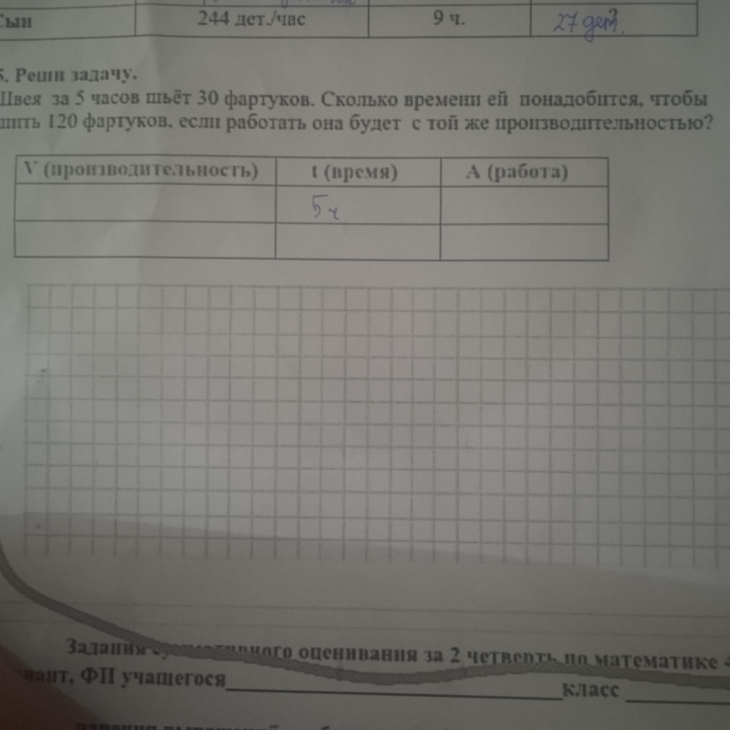 Швея за 5 часов шьёт 30фартуков.Сколько времени ей понадобится чтобы сшить 120 фартуков если работать она будет с той же производительностью(v производительность, t время, a работа)