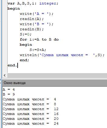 На картинке представлен код и результат работы программы, с помощью которой автор прланировал "Найти сумму всех целых чисел от A до B включительно". В программе допущены ошибки, из-за которых она работает неверно. Предполагалось, что при ввода чисел 4 и 9 программа покажет ответ "Сумма целых чисел = 39". Однако получился результат представленный на кратинке.