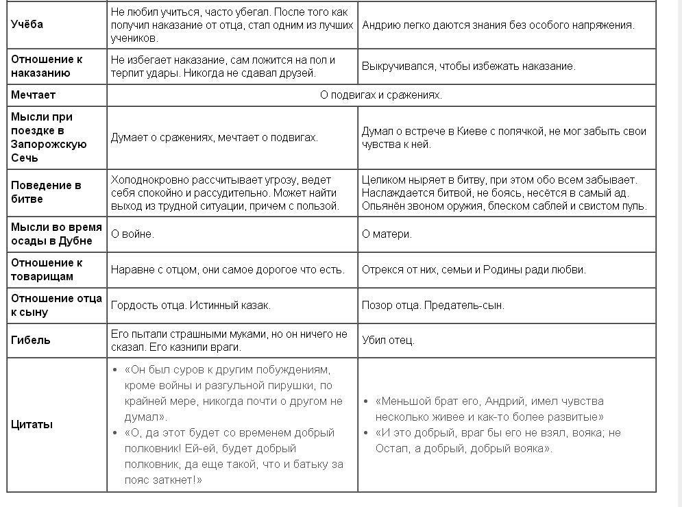 Сравнительная характеристика Остапа и Андрия из произведения "Тарас Бульба". По плану 1 Внешний облик 2 Отношение к учению и товарищам 3 Жизнь в Запорожской Сечи 4 Участие в боях 5 Гибель 6 Своё отношение.