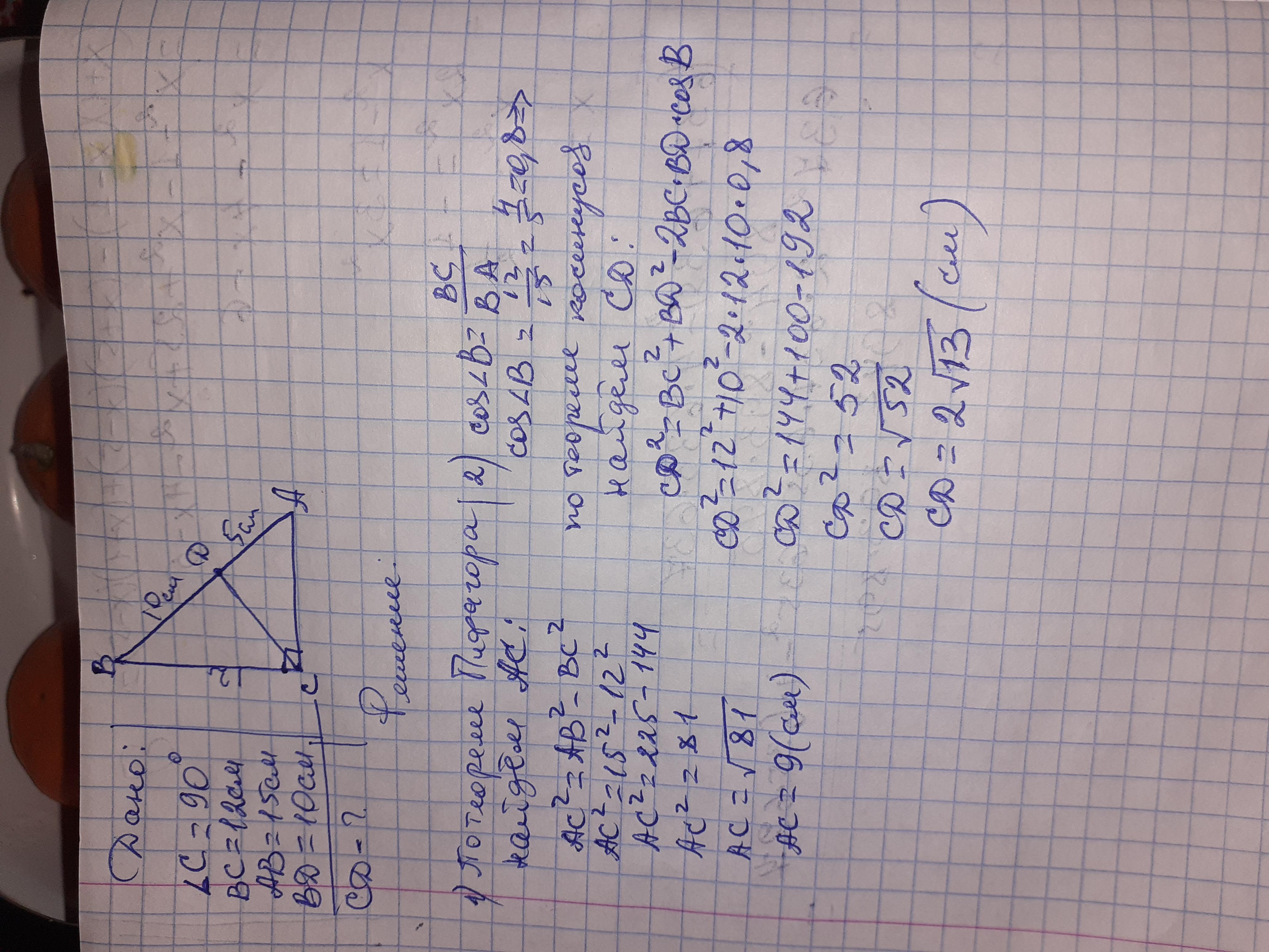 в треугольнике ABC угол С=90 градусов , ВС = 12 см, АВ=15 см. На гипотенузе АВ обозначили точку D ,так что BD = 10 см. Найдите отрезок CD. CD не является перпендикуляром к AB помогите срочно
