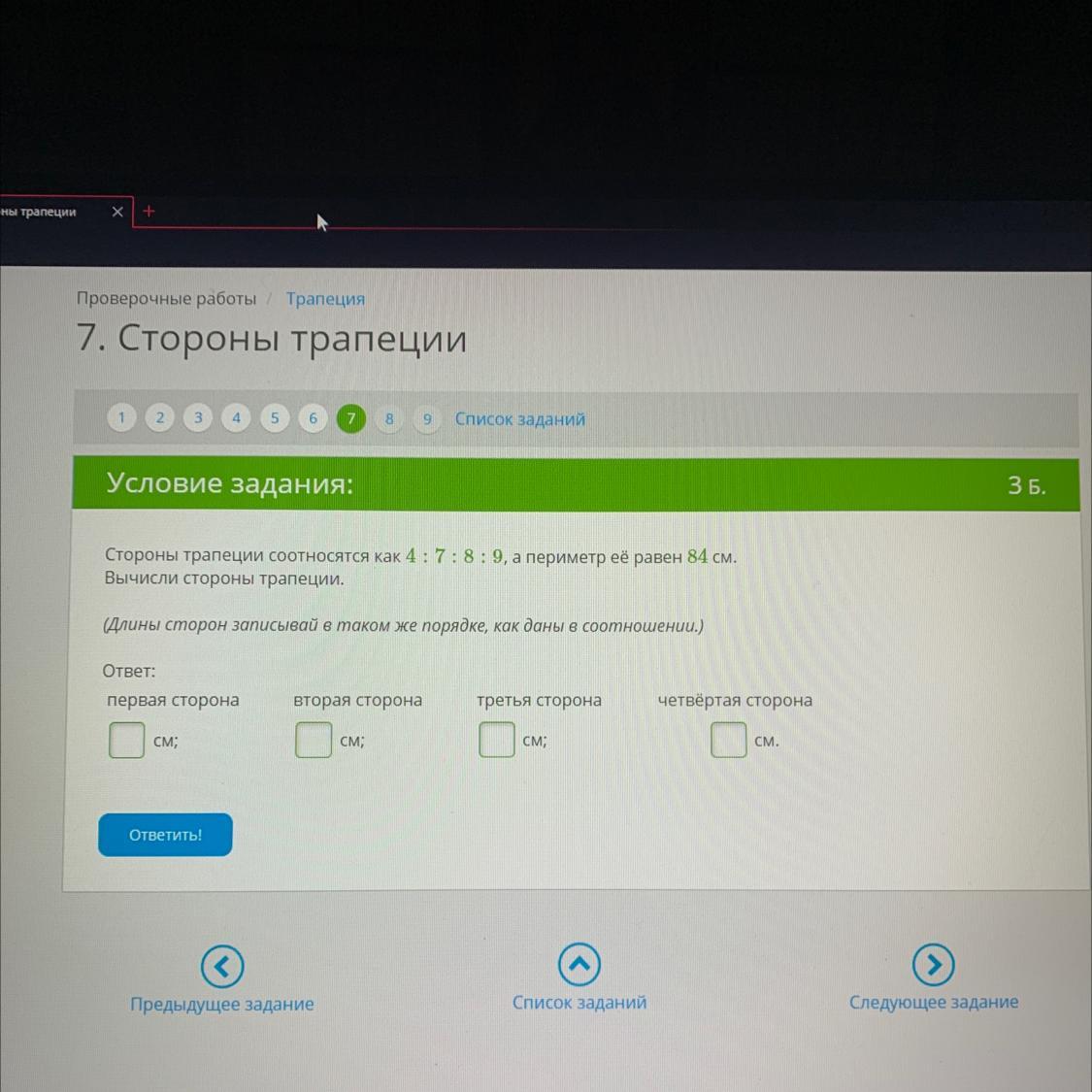 Стороны трапеции соотносятся как 4 : 7 : 8 : 9, а периметр её равен 84 см.