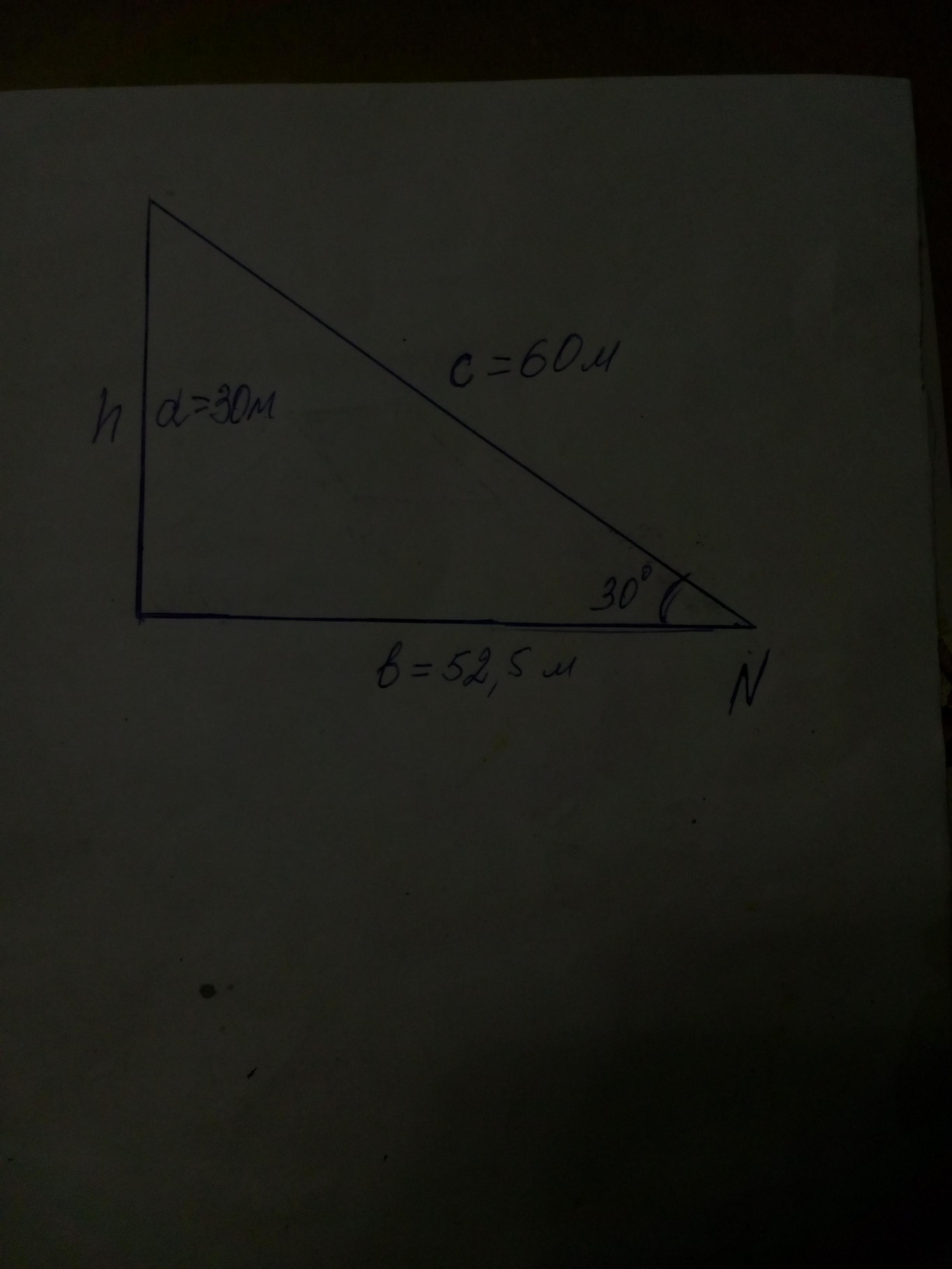 Вертикальная башня высотой 30 м видна из точки N на поверхности земли под углом 30° Найдите расстояния от точки N до основания башни и до самой высокой точки башни. С решением и чертежом пожалуйста
