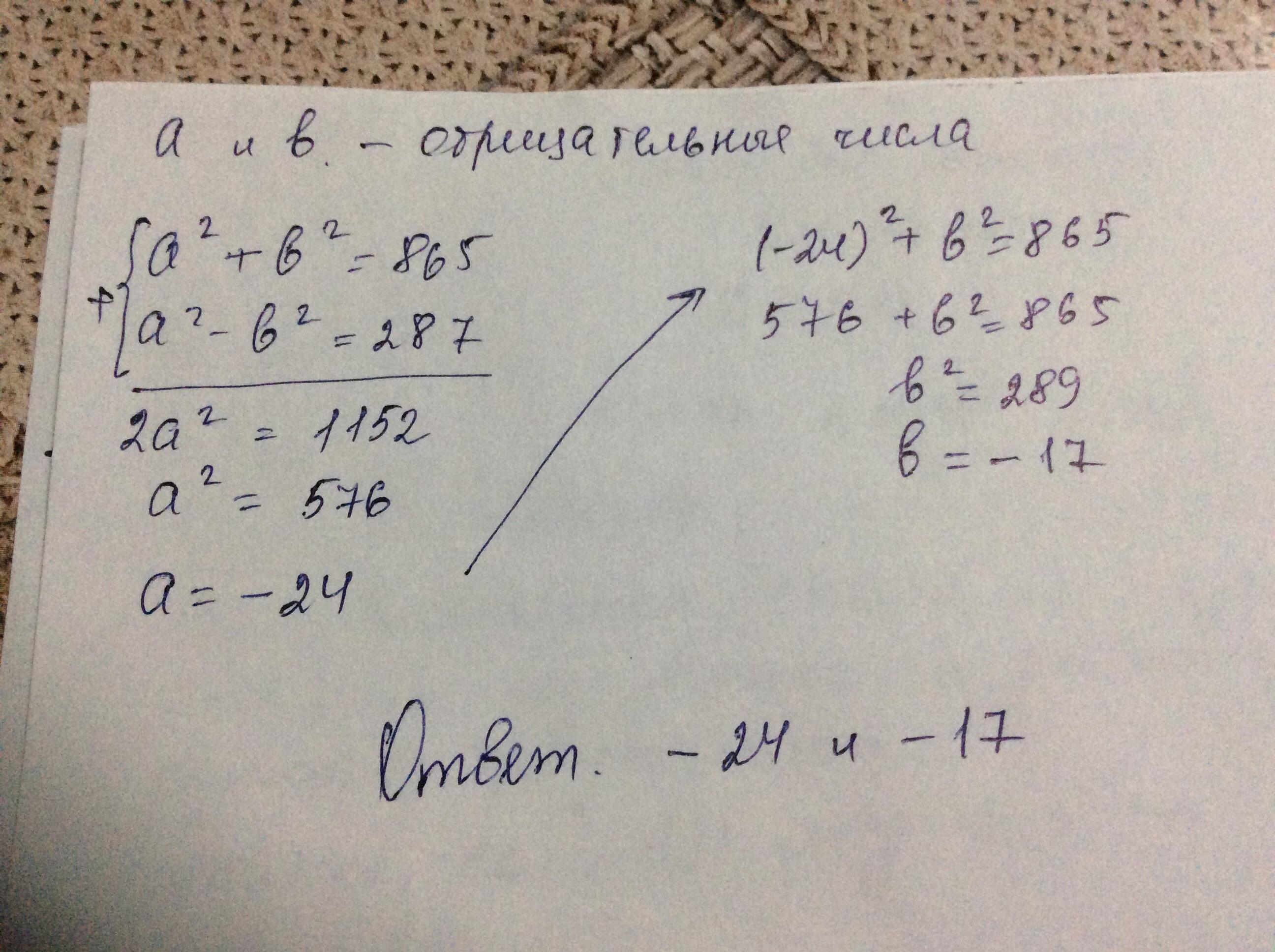 Сумма квадратов двух отрицательных чисел равна 865, а разность их квадратов равна 287 . Найди эти числа.