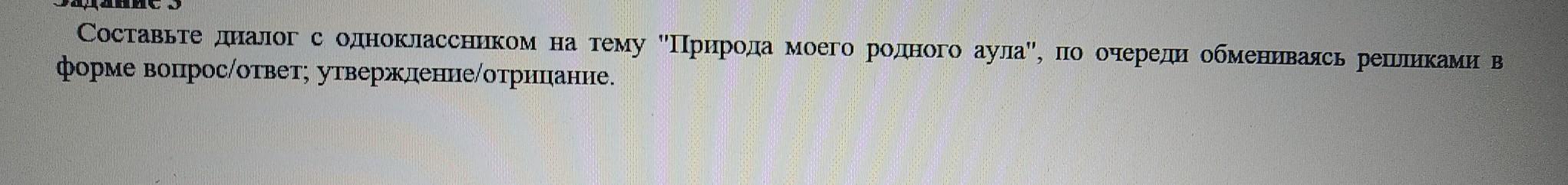 Составьте диалог с однакласником на тему "Природа моего родного аула"ПО очереди обмениваясь репликамив форма вопрос/ответ; утверждение/отрицание.