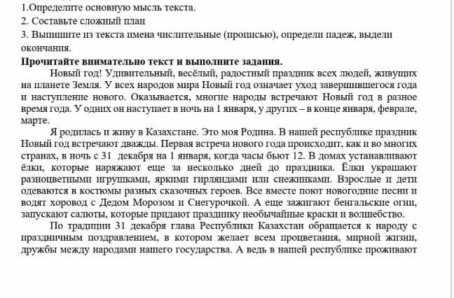 Определи основную мысль текста 2. Составьте сложный план 3. Выпишите из текста имена числительные, определи падеж , выдели окончания
