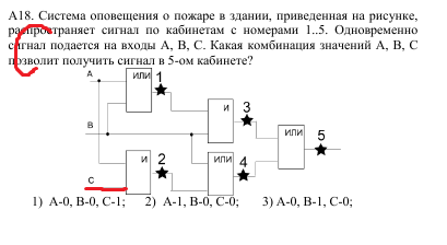 сигнал подается на входы A, B, C. Какая комбинация значений A, B, C