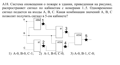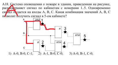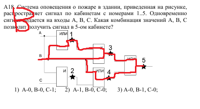 Если мы возьмем 3вариант, то сигнал пойдет от В влево, разделится вверх и вправо. Вверху он пройдет условие "1 или 0" и пройдет в 1кабинет, дальше пойдет к 3кабинету и столкнется с условием "1 и 0" тут он остановится. Теперь вернемся ко 2заряду, который пошёл вправо он опять разделится вниз и вправо, пойдем вправо и встретимся с условием "1 и 1" =true т.к. первый сигнал уже дошёл. Мы попали в 3кабинет идем дальше, встречаемся с условием "1 или 1". Попали в 5кабинет. Так же сигнал дойдет до 4кабинета.