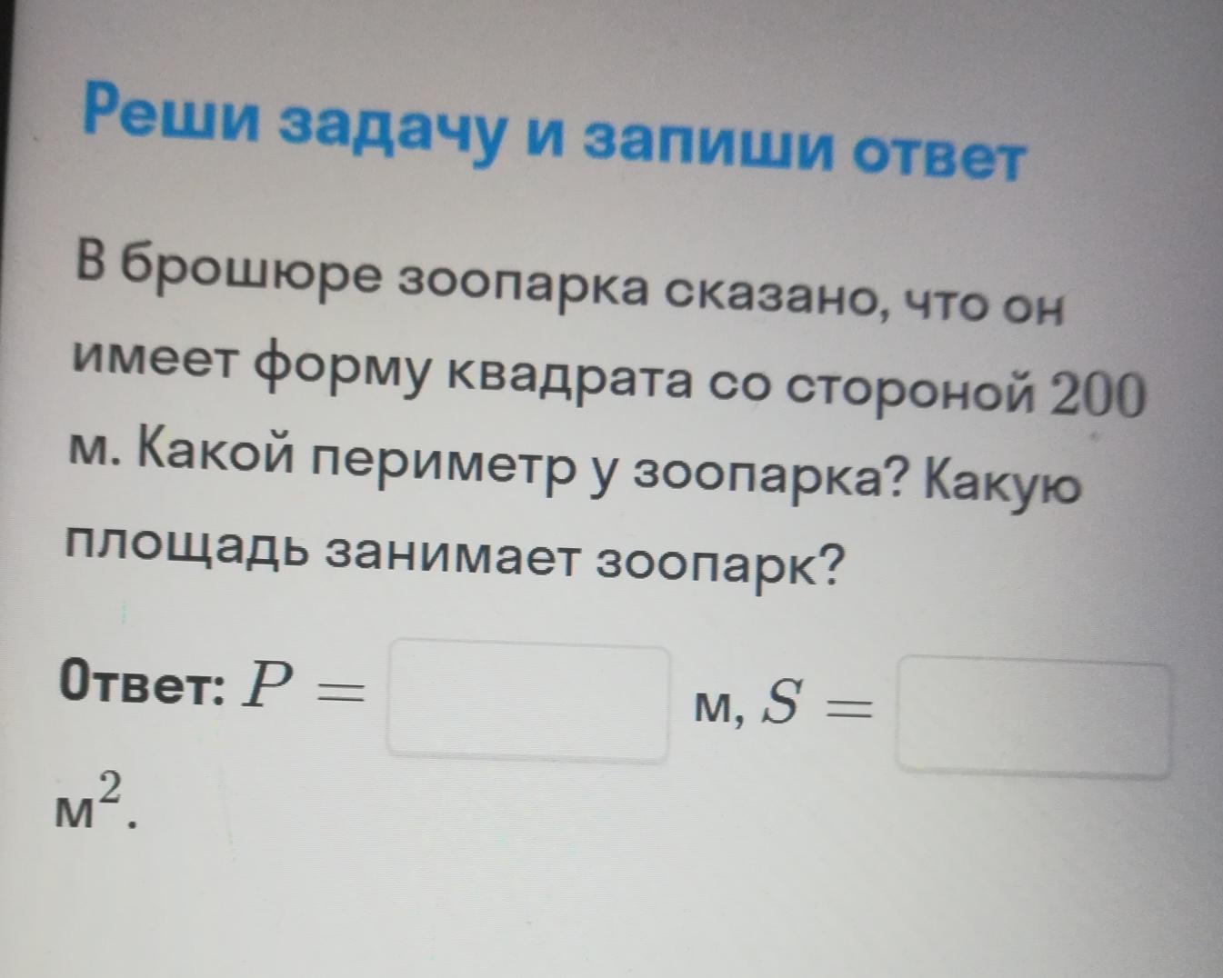 200 м, периметр это сумма длинн всех сторон площадь- это надо умножить 1) 200+200 -- 400 (м) 2) 400*200----- 80.00(м2) ( также логично же что, площадь зоопарка может занимать 80.00 м 2 ) ( метры в квадрате это когда надо умножить повторно тоесть, 80.00*2--- 160.000 но в математике можно и не писать так как надо упрощать) Ответ/ периметр зоопарка 400 метров, площадь 80.000 метров 2