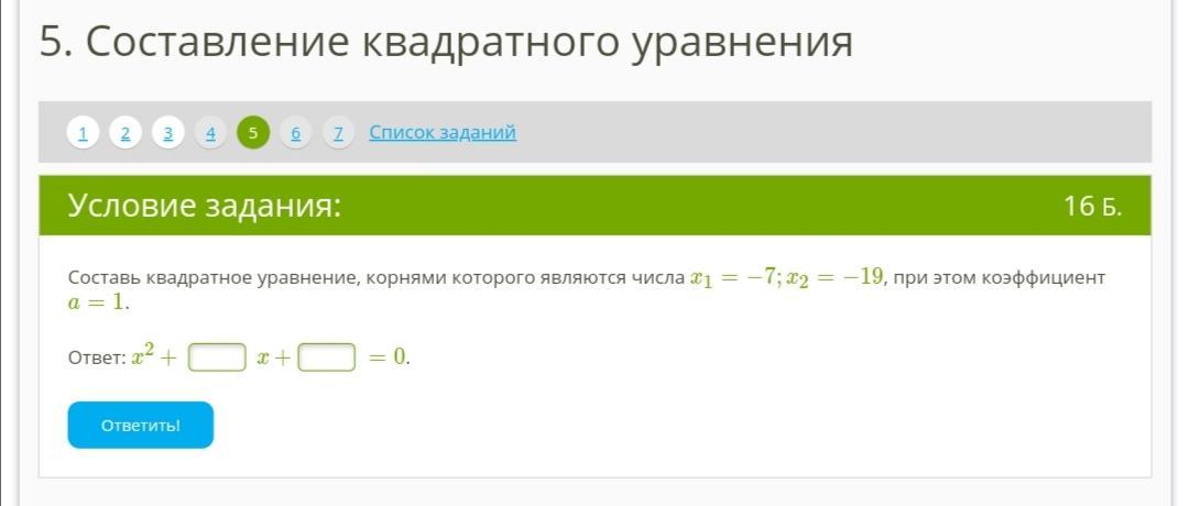Составь квадратное уравнение, корнями которого являются числа x1=−7;x2=−19, при этом коэффициент a=1.