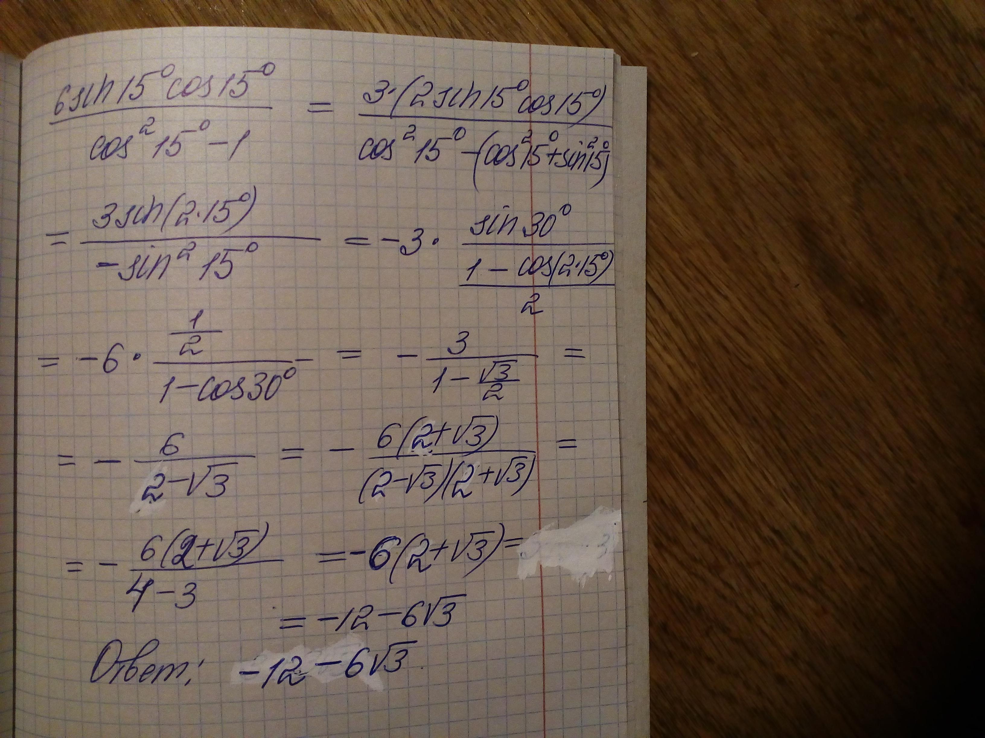 2) 6sin15°cos15° / cos^2 15° - 1