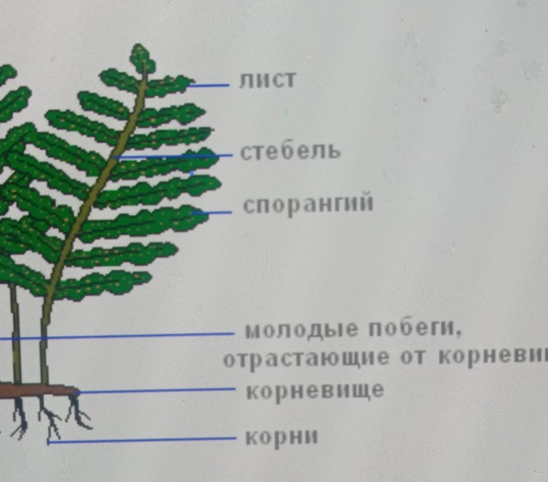 Тело папоротника состоит из листовых пластинок, черешка, видоизменённого побега и корней вегатативного и придаточного. Папоротники имеют короткий стебель представляющий собой корневище, находящееся в почве(лист, стебель, спорангий, молодые побеги, корневище, корни)