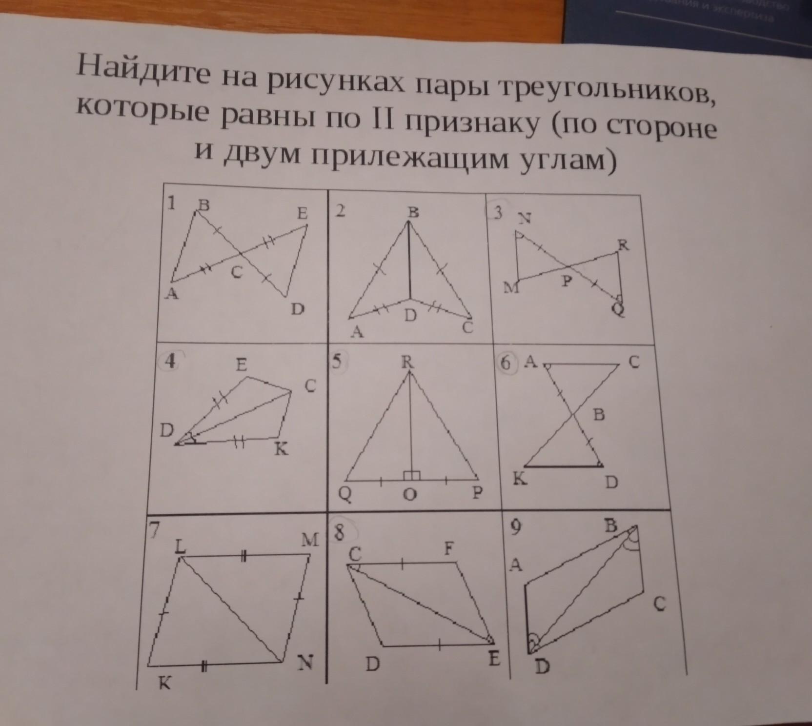 Даю 50 баллов!!! Найдите на рисунках пары треугольников, которые равны по || признаку (по стороне и двум прилежащим углам)