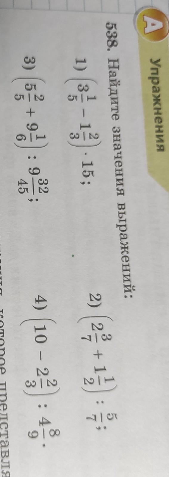 538. Найдите значения выражений: 1 2 1) (35 - 13). 15; ) 3 2) 2 + 1 2 ) 1) : 3) 5 + 94) : 932 ; - 2 4) 10 - 2 3 (2 2 8 : 4 9 6 45