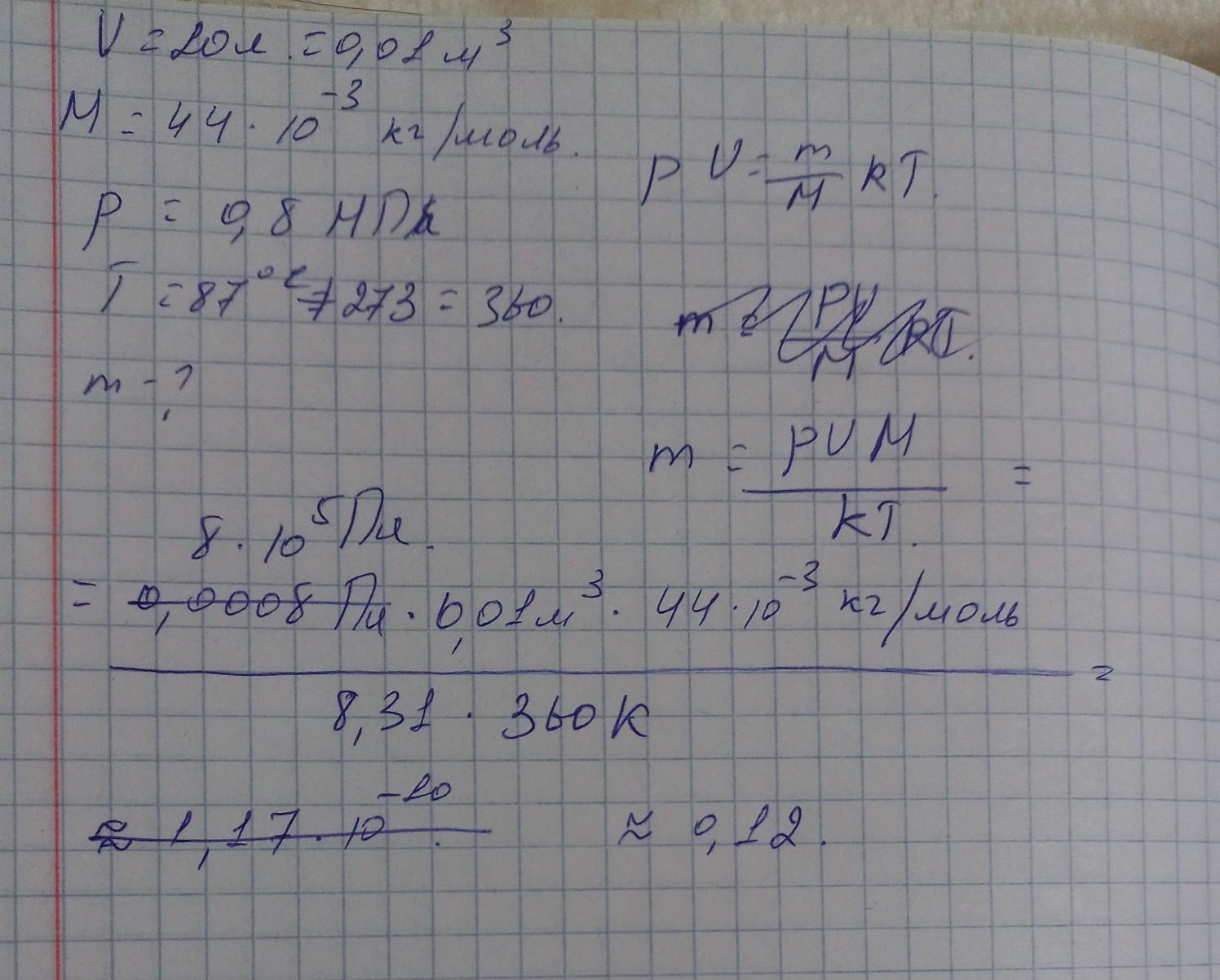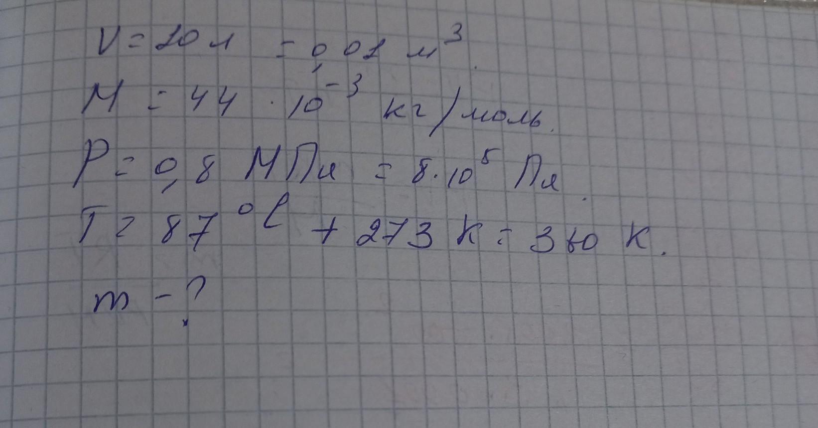 Имеется 10л углекислого газа СО2 (М=44-10-³ кг/моль) под давлением 0,8 МПа температуре 87°C. Найдите массу газа