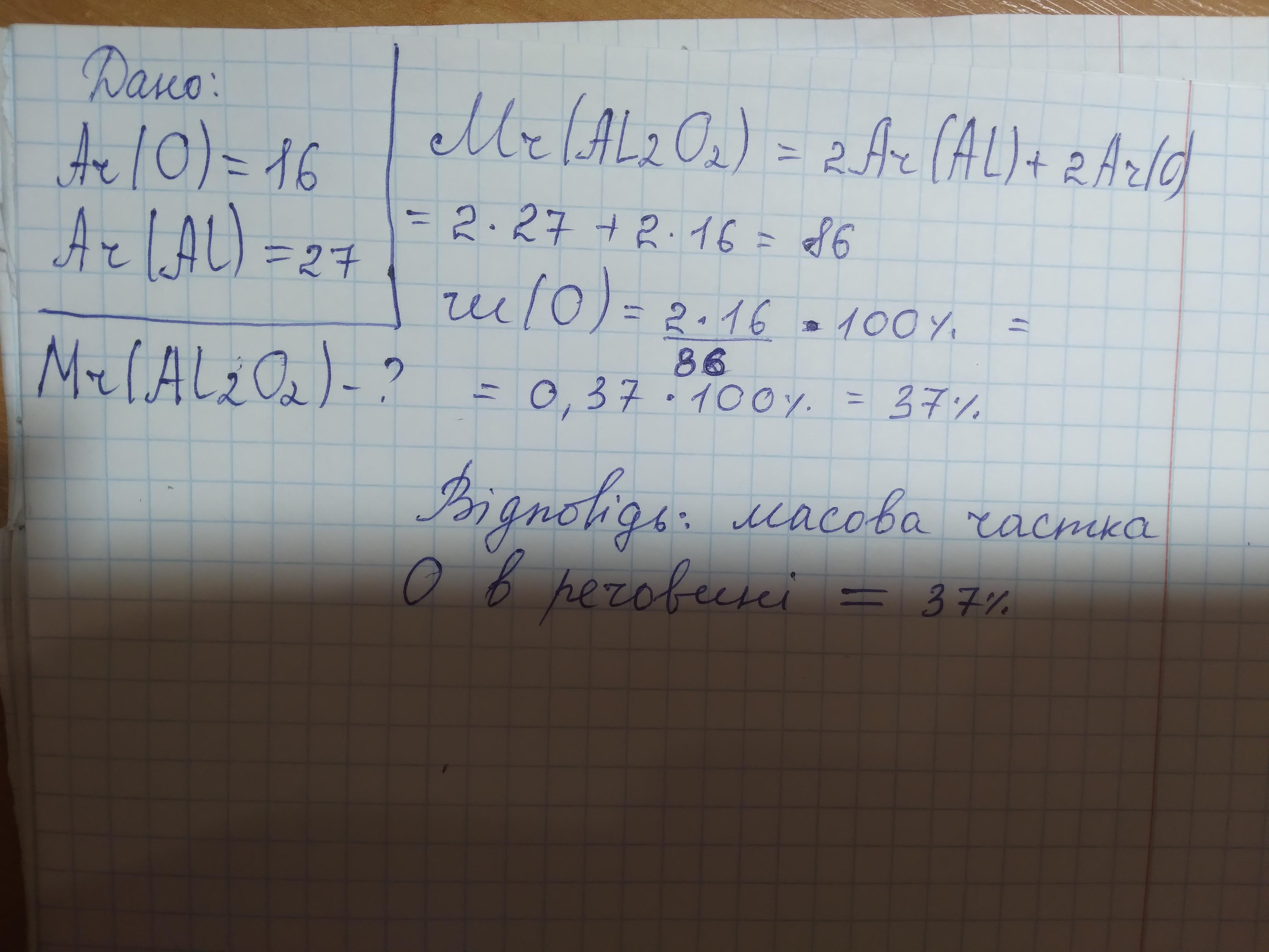 Виберіть формули для розрахунку масової частки оксигену в речовині AI2O2та виконайте розрахунки за цією формулою Ar(O)